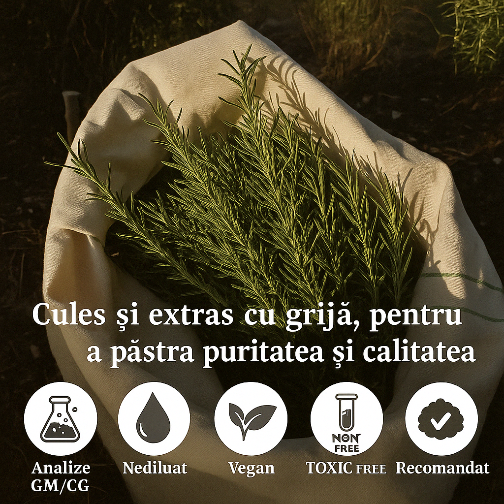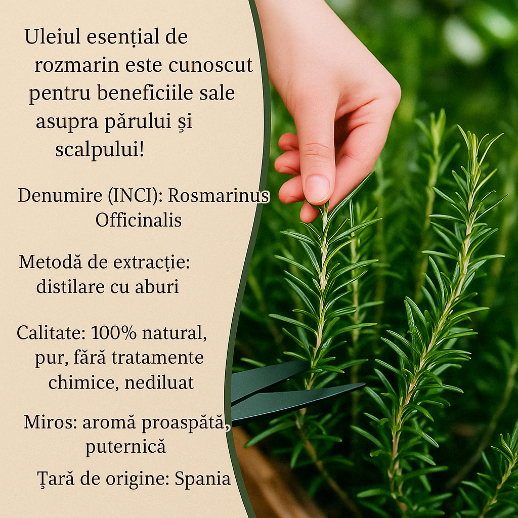 Uleiul de rozmarin este 100% pur și natural, obținut prin distilare cu aburi și fără aditivi. Fiecare picătură păstrează aroma și prospețimea plantei, oferind o experiență autentică de îngrijire.