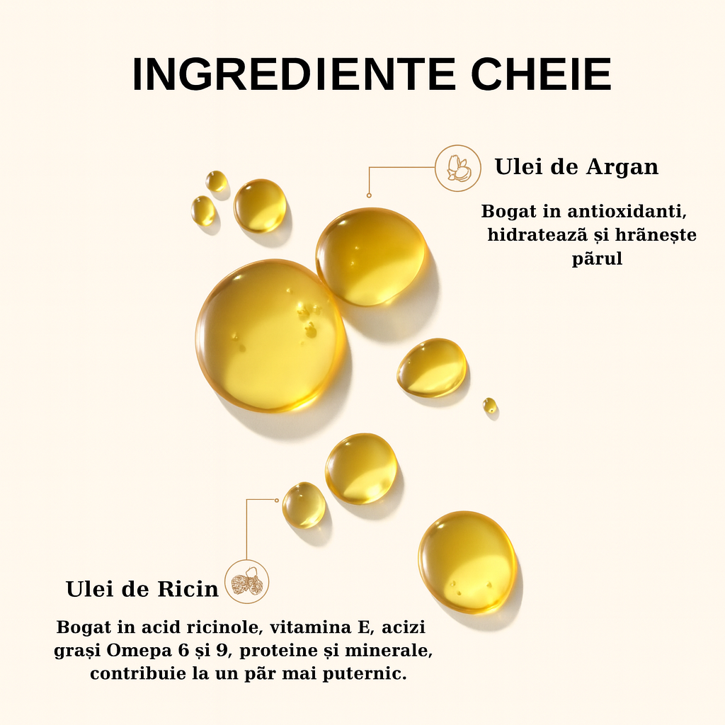 Acesta nu este un ser obișnuit. Este creat din doar două ingrediente puternice — Ulei de Ricin și Ulei de Argan — ambele recunoscute pentru capacitatea lor de a revitaliza intens firul de păr.